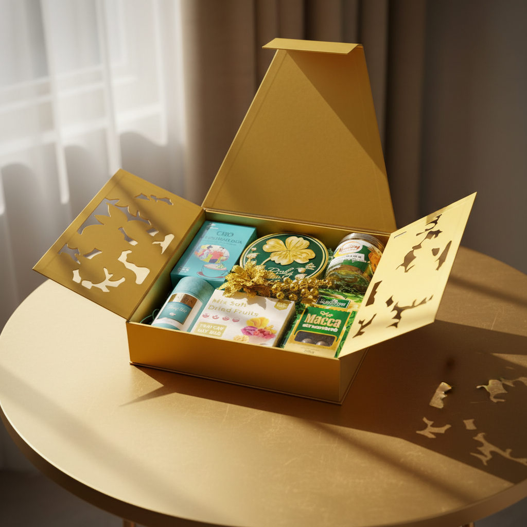 Hộp cứng – túi quà đồng bộ, phối màu vàng chủ đạo kết hợp chi tiết đỏ may mắn.